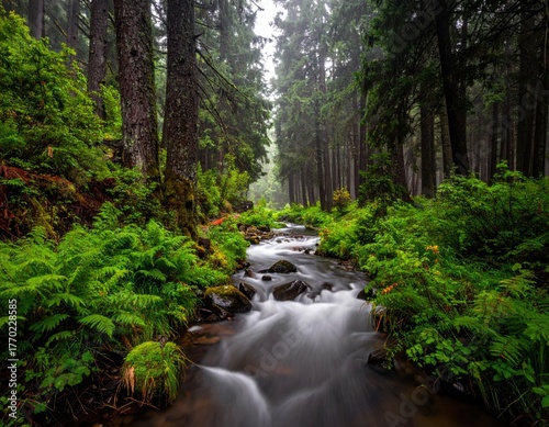 Obraz premium Misty forest stream flowing through lush greenery