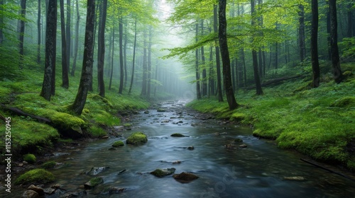 Fototapeta premium Misty Forest Stream Flows Through Lush Green Woods