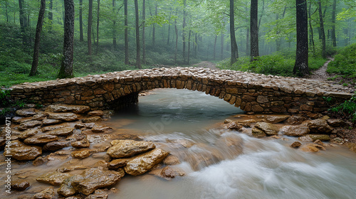 © cris, Obraz premium Misty forest stream flows under a quaint stone arch bridge