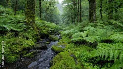 © Giman, Obraz premium Misty forest stream, lush ferns, tranquil valley, nature background, ideal for relaxation
