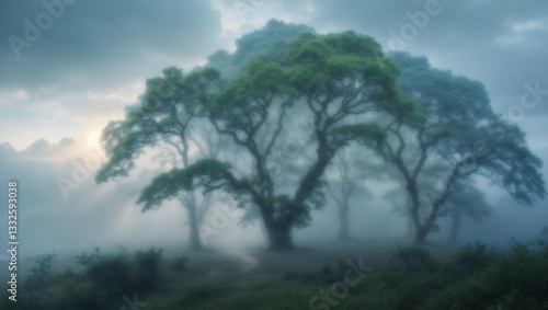 © Taha, Obraz premium Misty Forest Sunlight