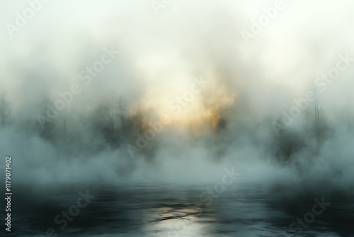 Fototapeta premium Misty forest sunrise, ethereal landscape.