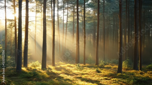 © Yopi, Fototapeta premium Misty Forest Sunrise: Golden Light Filtering Through Pine Trees
