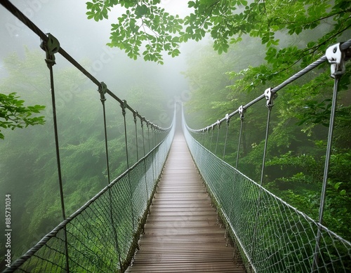 Obraz premium Misty forest suspension bridge amidst lush foliage