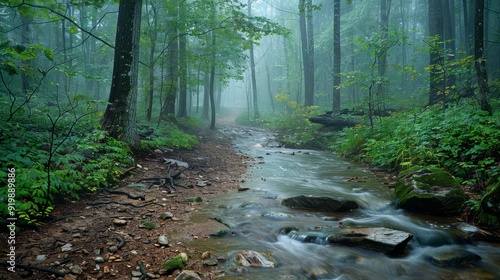 © Anastasiia, Obraz premium Misty forest trail beside a flowing stream during early morning hours