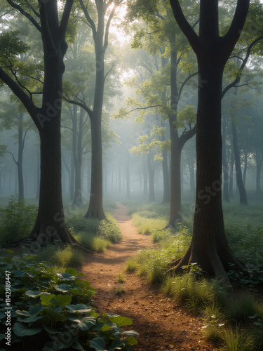 © Julien, Obraz premium Misty forest trail invites exploration through lush greenery at dawn