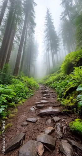 Obraz premium Misty Forest Trail, Stone Path, Hiking, Nature, Adventure