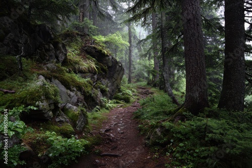 Fototapeta premium Misty forest trail surrounded by lush greenery and rocky outcrops on a serene...