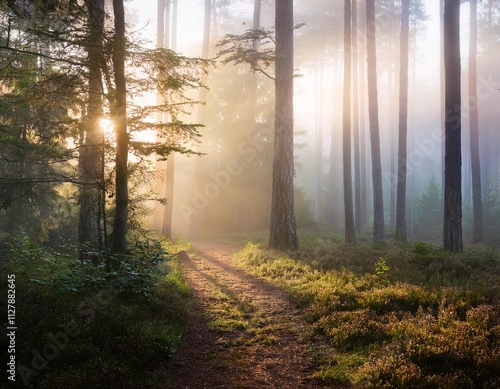 © Artbi, Fototapeta premium Misty Forest Trails at Dawn: Enigmatic Natural Beauty