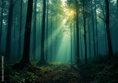 © puruan, Obraz premium Misty forest trails with sunlight filtering through tall trees in early morning