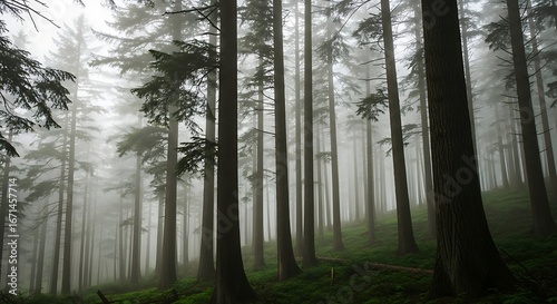 Obraz premium Misty Forest Trunks and Canopy.