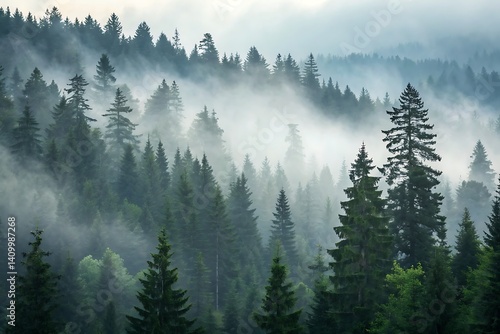 © imam, Obraz premium Misty Forest Valley – A Serene Landscape of Lush Green Hills and Rolling Fog