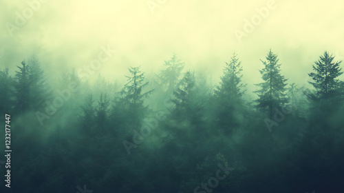 © YessyIzzatun, Naklejka premium Misty forest view with soft green hues.