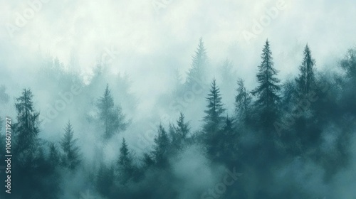 Fototapeta premium Misty forest view with trees shrouded in fog, creating an enchanting and...