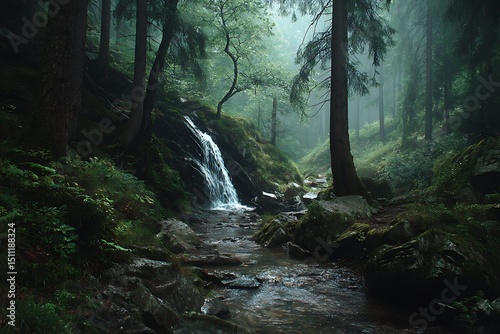 © stok, Obraz premium Misty Forest Waterfall Stream.