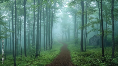 © SITTAKAN, Obraz premium Misty forest with a hidden path revealed by morning light, explorers finding a forgotten cabin, foggy forest, path discovery