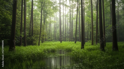 Fototapeta premium Misty forest with a small stream. Sunlight filtering through the trees. Use...