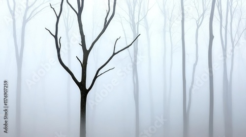 Fototapeta premium Misty forest with bare trees creating a serene atmosphere.