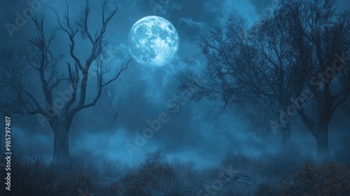 Fototapeta premium Misty forest with dry trees and full moon in dark night setting