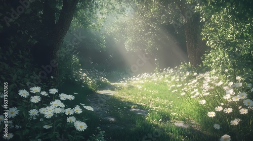 Fototapeta premium Misty forest with flowers and soft light