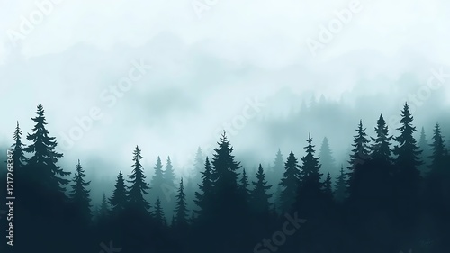 Obraz premium Misty forest with pine trees, foggy landscape, ethereal atmosphere, green...