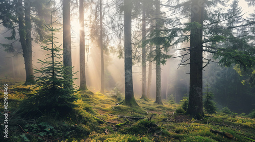 Naklejka premium Misty forest with sun rays breaking through the trees