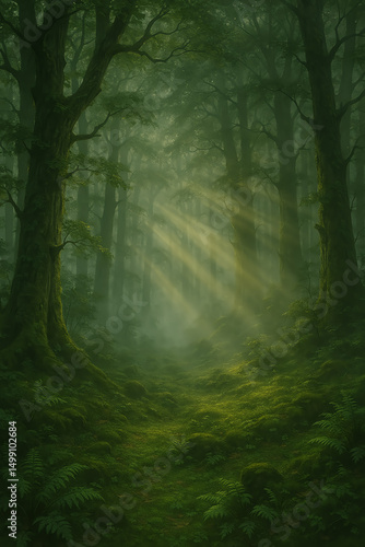 © Milagro, Naklejka premium Misty forest with sun rays shining through trees.