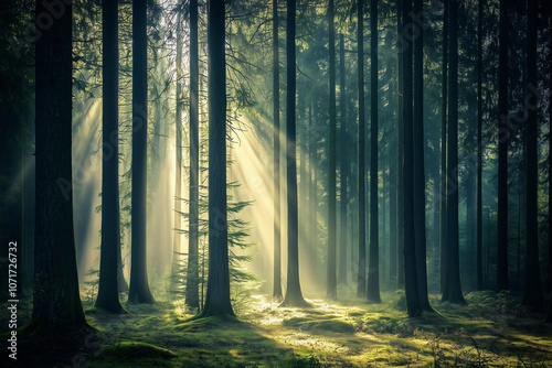 © Nomad_Soul, Naklejka premium Misty forest with sunlight filtering through the tall trees. Generative AI