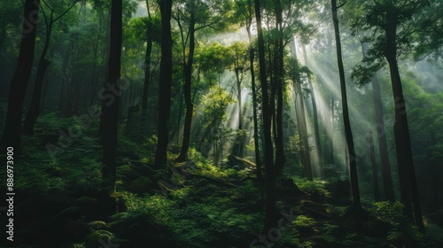 © Eazsty, Obraz premium Misty forest with sunlight interspersed with trees