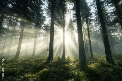 Obraz premium Misty Forest with Sunlight Rays and Tall Trees in Natural Setting