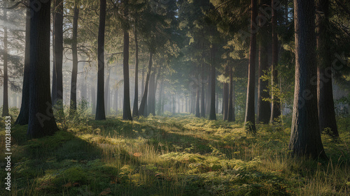 Naklejka premium Misty Forest with Sunlight Streaming Through Tall Trees