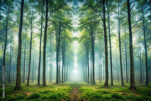 © Kingphet, Obraz premium Misty forest with symmetrical trees and fog in the background