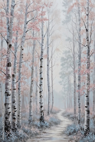 © figi, Obraz premium Misty forest with tall birch trees and pink blossoms, creating an ethereal and tranquil scene.