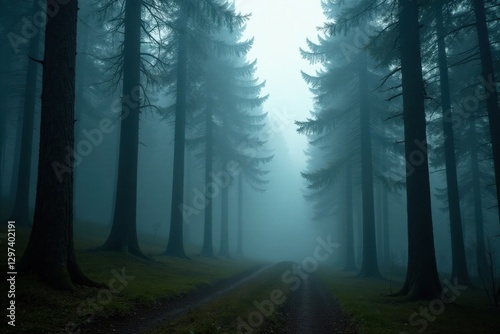 Naklejka premium Misty forest with tall firs and foggy atmosphere, nature, woodland