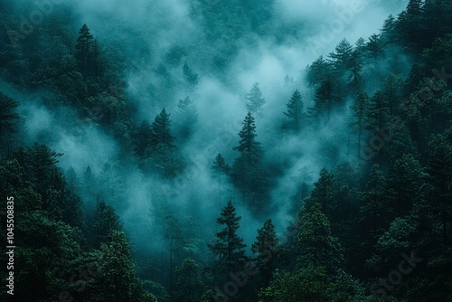 Fototapeta premium Misty Forest with Tall Pine Trees