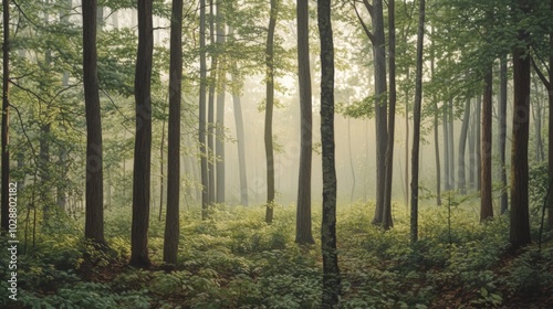 Obraz premium Misty Forest with Tall Trees and Lush Undergrowth