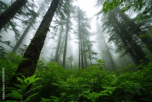 © Riya, Fototapeta premium Misty Forest with Towering Trees