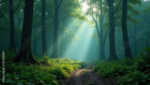 Obraz premium misty forest with towering trees and a winding path, pathway, serenity