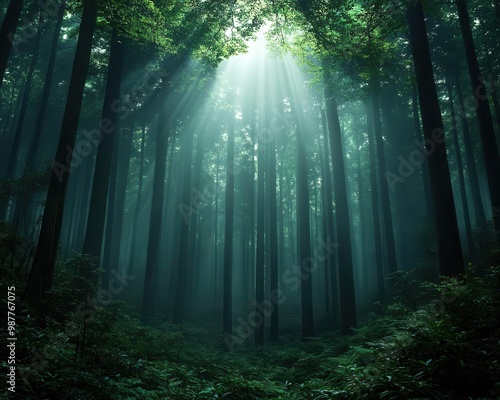 Obraz premium Misty forest with towering trees, sunlight breaking through the canopy,...