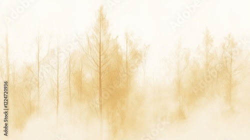 Fototapeta premium Misty, golden autumn forest scene with bare trees in fog.