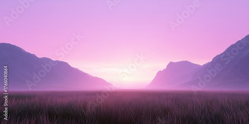 Fototapeta premium Misty grasslands with pastel sky, Peaceful lavender sunrise above foggy...