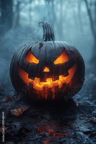 © Oleksandr, Naklejka premium Misty graveyard with flickering lanterns sets a chilling Halloween backdrop