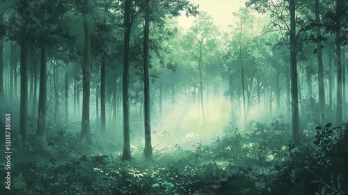 © harryaishi, Obraz premium Misty green forest path in sunlight.