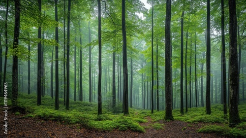 Obraz premium Misty green forest path with tall trees and lush undergrowth.