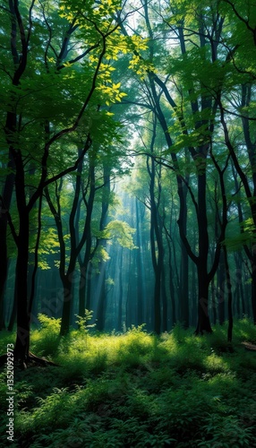 © dadtophoto, Obraz premium Misty green forest, sunlight filtering through dense canopy, natural, leaves