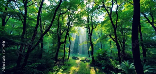 Naklejka premium Misty green forest, sunlight filtering through dense canopy, tranquil, calm
