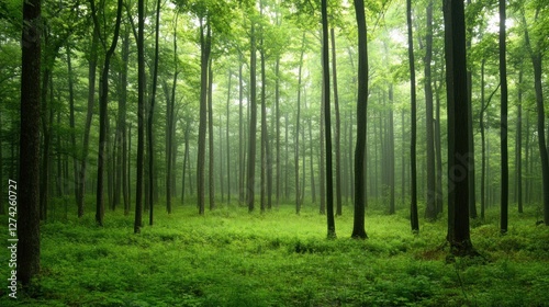© Biancaart, Naklejka premium Misty Green Forest Trees Lush Undergrowth