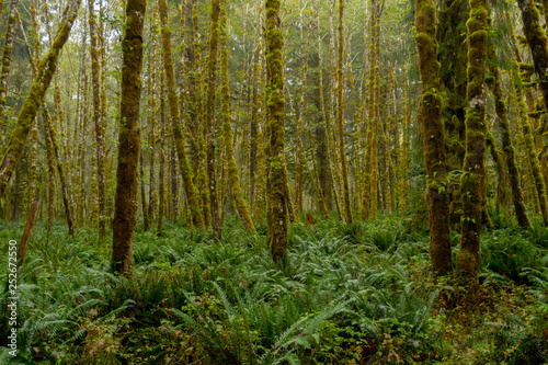 © kellyvandellen, Fototapeta premium Misty Green Forest with Ferns Covering Ground