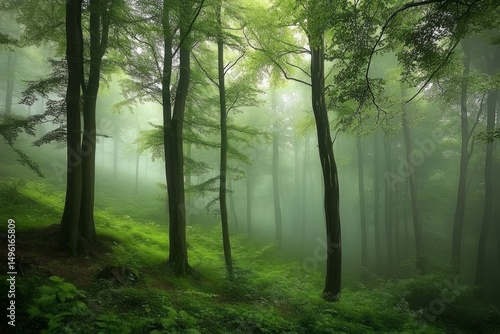 Obraz premium Misty Green Forest With Sunlight Streaming Through Trees