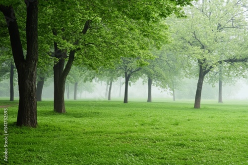 © Artlog Studio, Fototapeta premium Misty Green Park: Tranquil Spring Morning